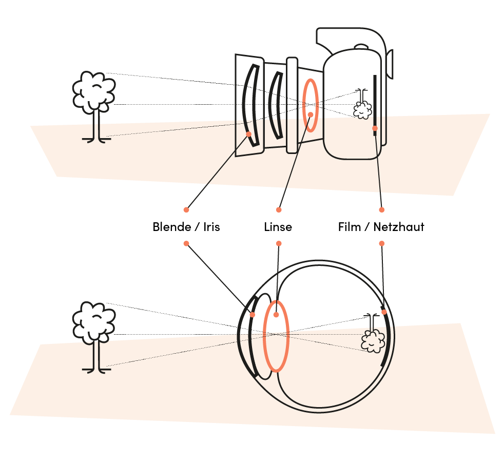 - Die Bildgebung findet schließlich auf der Netzhaut statt, auf der die einfallenden Lichtstrahlen gebündelt werden. In der Kamera entspricht dies dem Film oder – moderner gesprochen – dem Sensor.